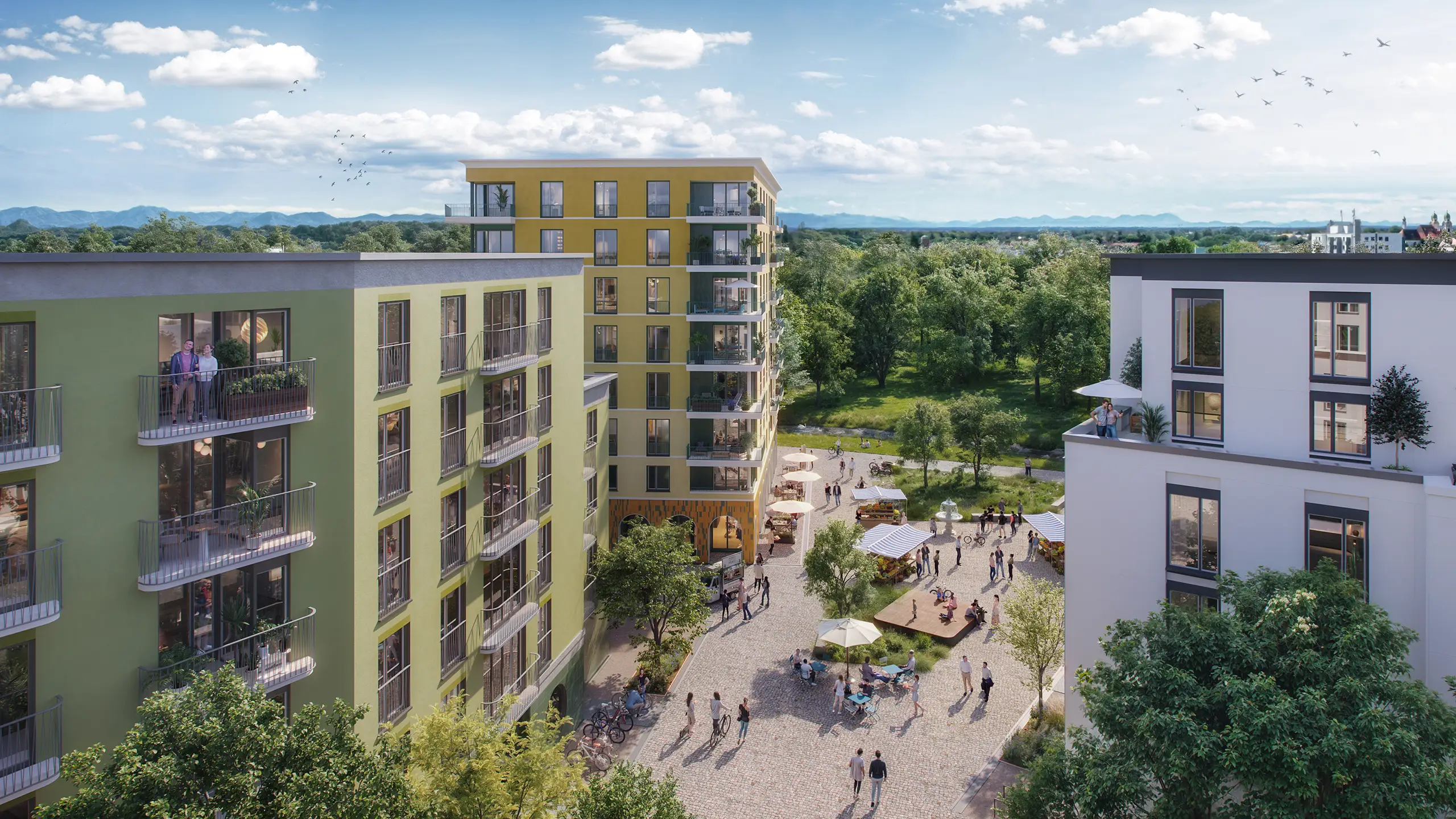 Offene Plätze laden zum Verweilen ein, Wege verbinden Nachbarn, Gemeinschaft wird erlebbar. Und wer den Puls der Stadt sucht, erreicht in wenigen Minuten die Münchner Innenstadt.