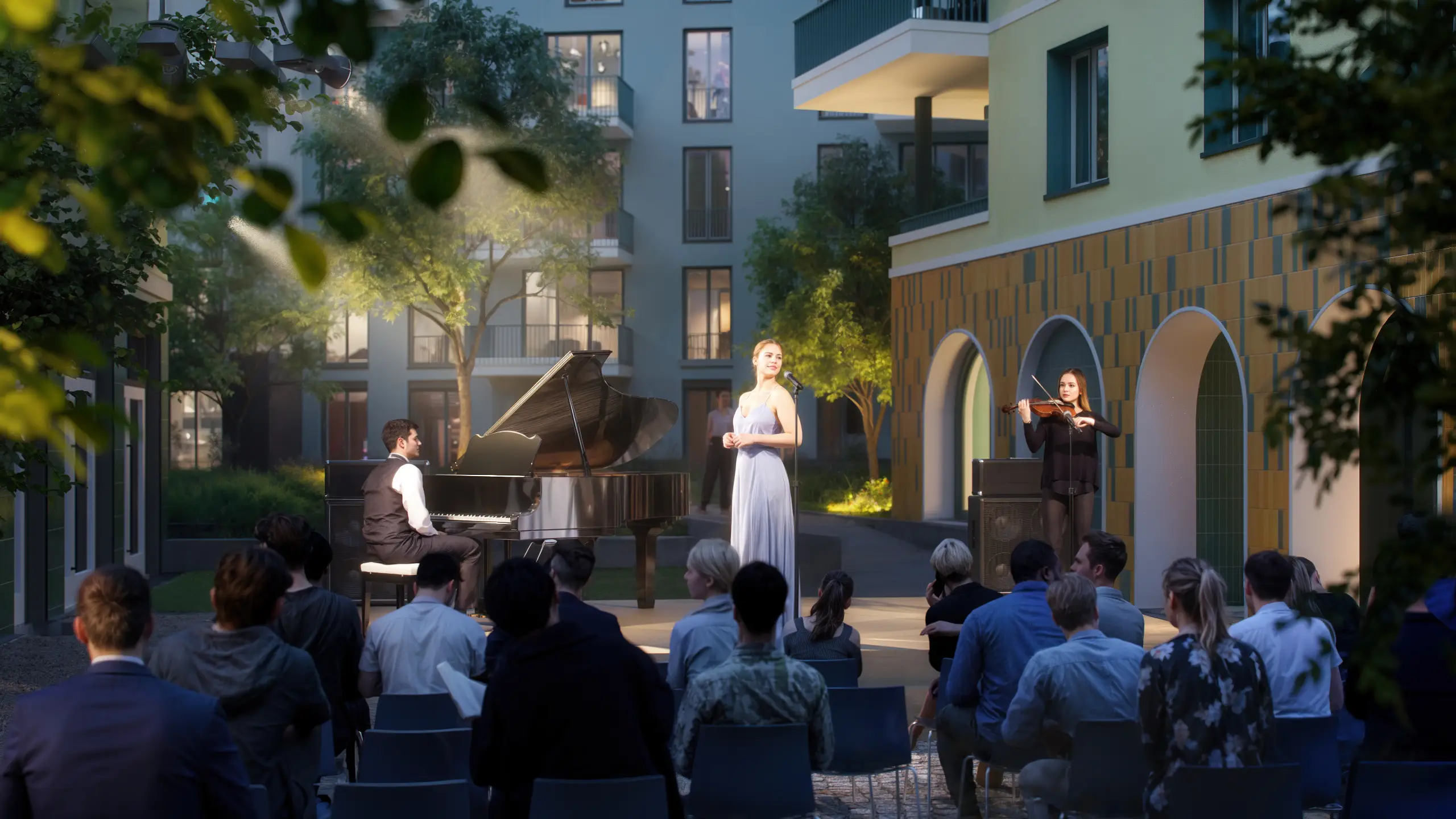 Der Veranstaltungsbereich ist ein flexibler Raum für Kultur, Bildung, Sitzungen, Sport oder als Ergänzung zum Co-Working. Auch private Feiern und die Einbindung der Gastronomie – von Catering bis Sommernutzung der Freiflächen – sind vorgesehen. Organisation und Verwaltung übernimmt das Quartiersmanagement. Dank vielseitiger Ausstattung lässt sich der Bereich an unterschiedliche Formate anpassen und bietet so eine breite Nutzungsvielfalt.
