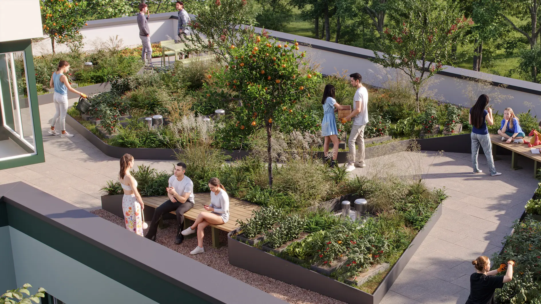 Im Urban Gardening-Bereich auf einer der großzügigen Dachflächen können in Hochbeeten oder flachen Pflanzbeeten eigenes Gemüse, Kräuter und Blumen angebaut werden.