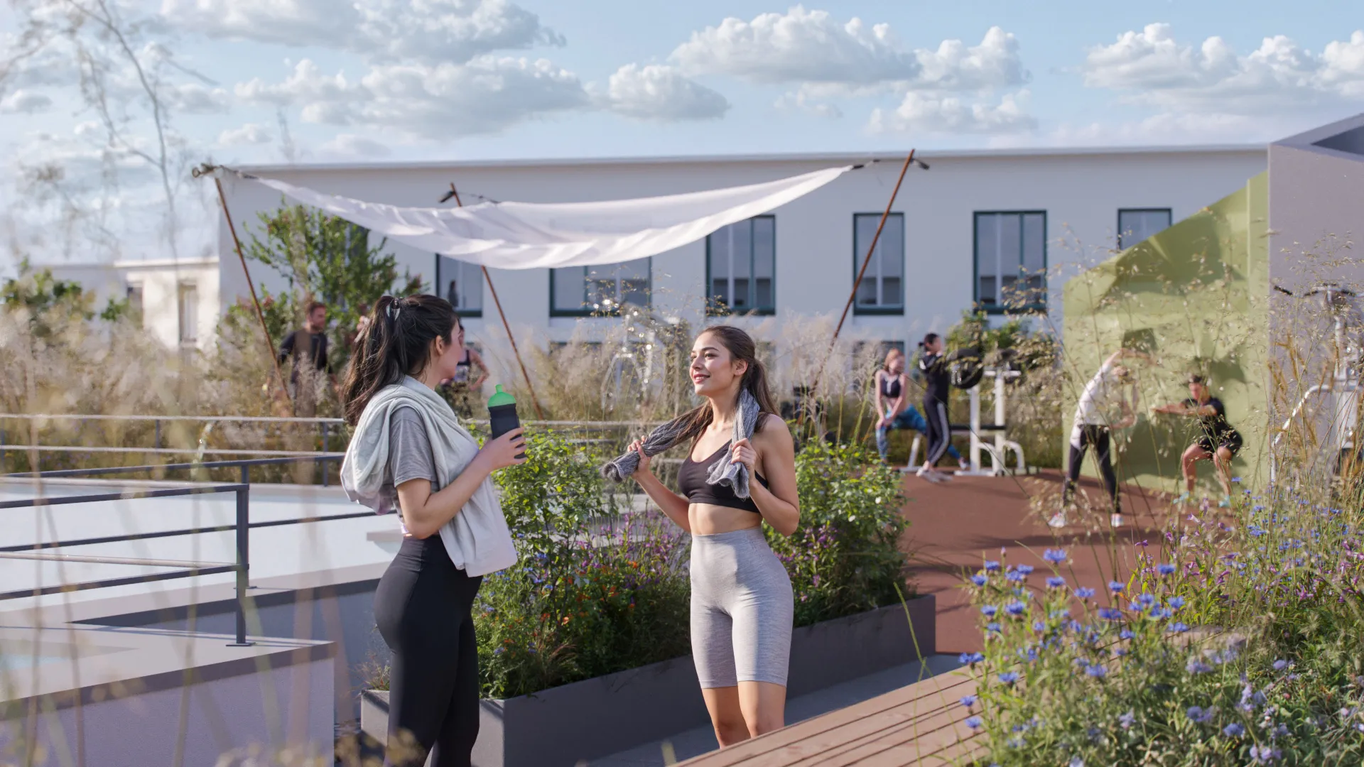 Auf dem Sportdach des ORPLID erwarten Sie verschiedenste Sportgeräte zur freien Nutzung – ein Ort für Fitness, Begegnung und atemberaubende Ausblicke.