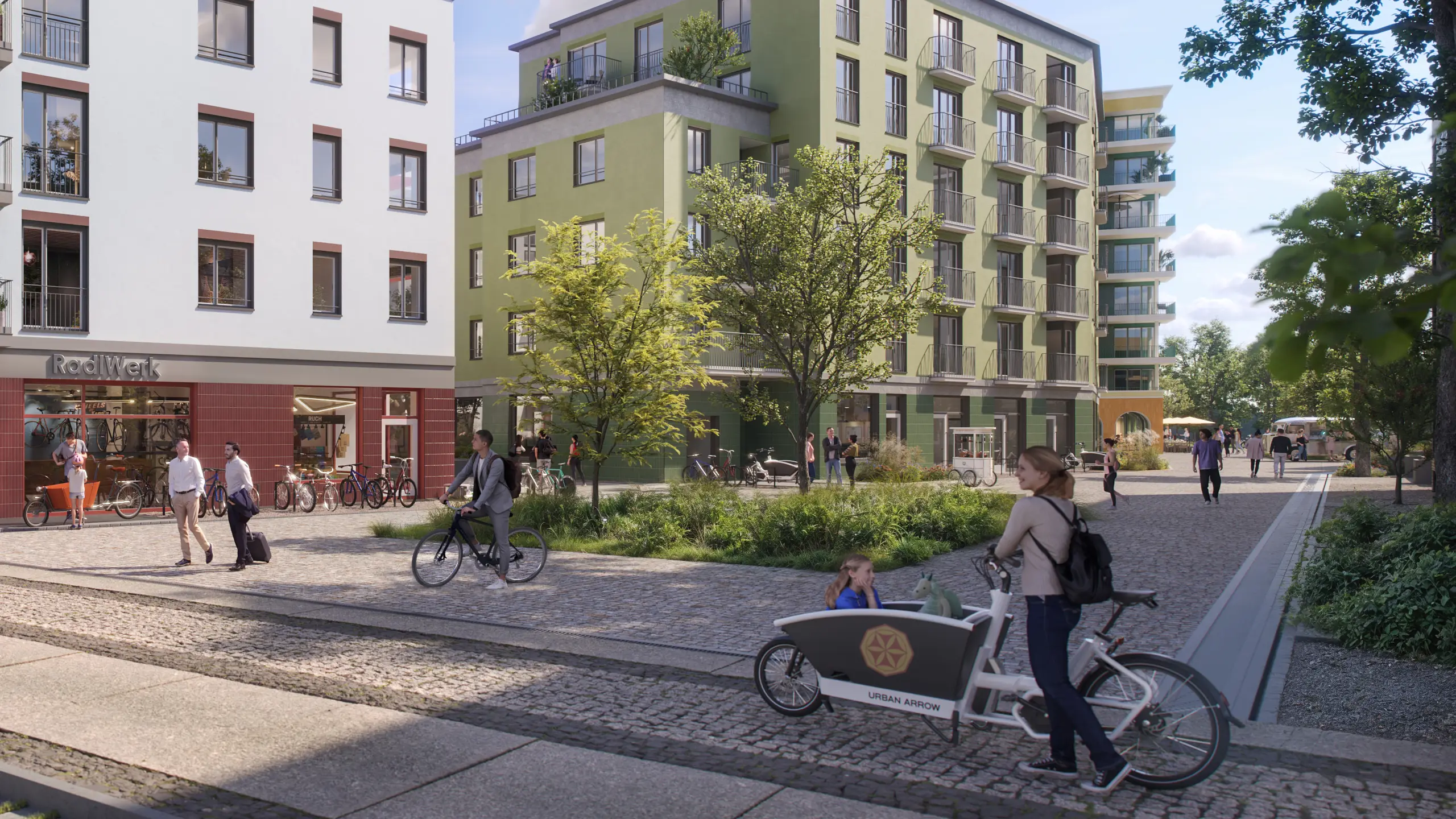 Obststreuwiesen, Urban-Gardening-Flächen und blühende Gassen laden zum Verweilen ein, während der fantasievolle Drachenspielplatz Abenteuer und Spielfreude für Kinder bietet.